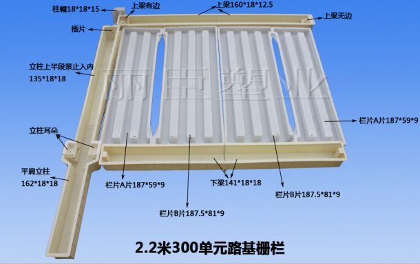 3.最后采用PP塑料的高铁防护栅栏栏片模具,一样有4个组成部分,尺寸分别为: