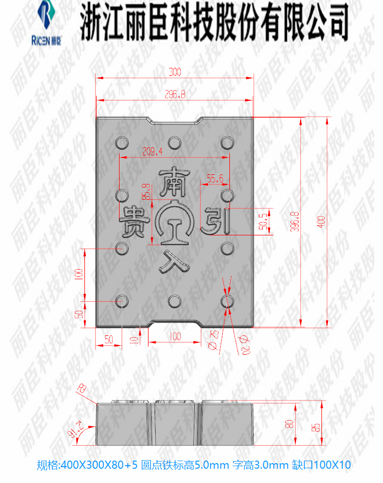 贵南引入系列盖板,主要用于高铁隧道盖板定制系列、盖板为缺口圆点带铁标、板面带字,为“贵南引入”。这款系列有三款尺寸盖板尺寸分别为40cm*30cm、40cm*40cm、80cm*50cm、厚度相同为8cm厚,且三款模具的缺口也不同从小到大的尺寸缺口为10cm、20cm、30cm缺口,这款盖板为2022年新生产的盖板。