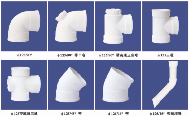 Φ125/90°弯头,Φ125/90°带口弯头,Φ125/90°带疏通正角弯头,Φ125三通,Φ125带疏通三通,Φ125/45°弯管,Φ125/15°弯管,Φ125/45°弯预埋管,Φ125*200*8下接管,Φ125外接管箍,Φ125直管,Φ160*300*8、Φ160*400*8、Φ160*510*8预埋管,Φ125*300*8斜底、平地预埋管,Φ125*400*8、Φ125*510*8预埋管,Φ170*38管盖,Φ135*38管盖,200*250*10管篦,250*200*10管篦,200*150*10、200*150*20管篦及Φ125吊卡管卡等多种配件。