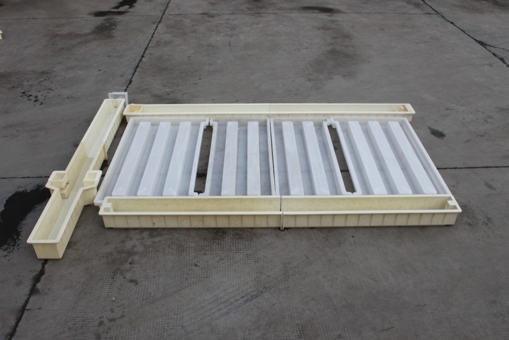 护栏栏片模具在高速路基护栏模具里面设置了4片式设计,水泥栏片成型为4+3+3+4的组合模具,尺寸分别为149.5*81*9cm2片,149.5*59*9cm2片。在使用整个路基护栏模具浇筑水泥制品过程中,水泥栏片模具为使用率相对较高的模具,采用PP聚丙烯原料更好的韧性可以更好的提高模具的使用次数。